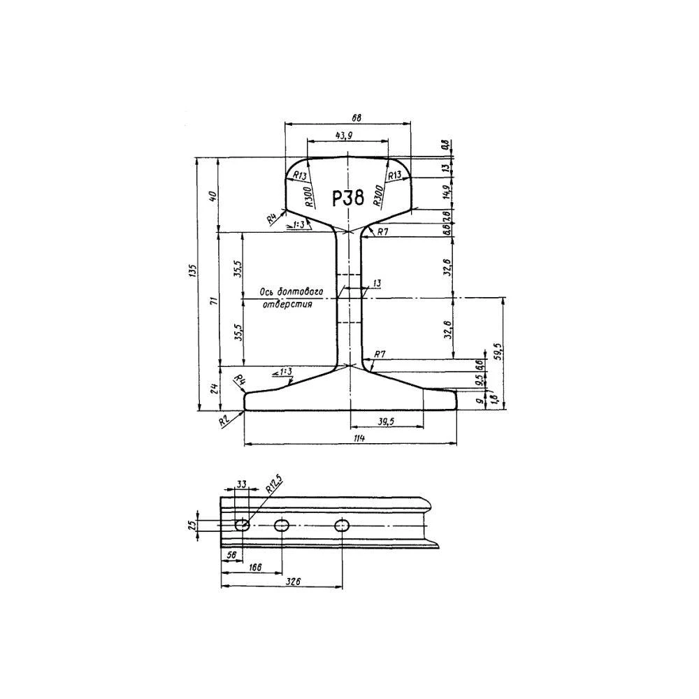 Мы продаем железнодорожный рельс Р38, отгружая со своего склада в Омске продукцию, отвечающую всем действующим нормативам. Согласно ГОСТ 30165-94 и ДСТУ 2539-94, габаритные размеры данного металлопроката составляют 135 мм. в высоту и 114 мм. в ширину (ширина основания). Толщина головки при этом составляет 68 мм., толщина шейки – 13 мм. Рельсы Р38 отгружаются заказчикам в зависимости от приобретаемого тоннажа: при мерной длине в 12,5 метров масса одной рельсы составляет около 481 кг. При необходимости мы готовы поставить заказчику прокат немерной длины – отрезками от 4 до 12 метров.